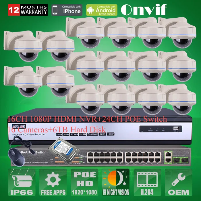 Main Features : 24CH POE Switch 16CH NVR System Onvif H.264 1080P 2MP HD Outdoor Vandal-proof IR Network Security POE IP Camera 6TB HDD
